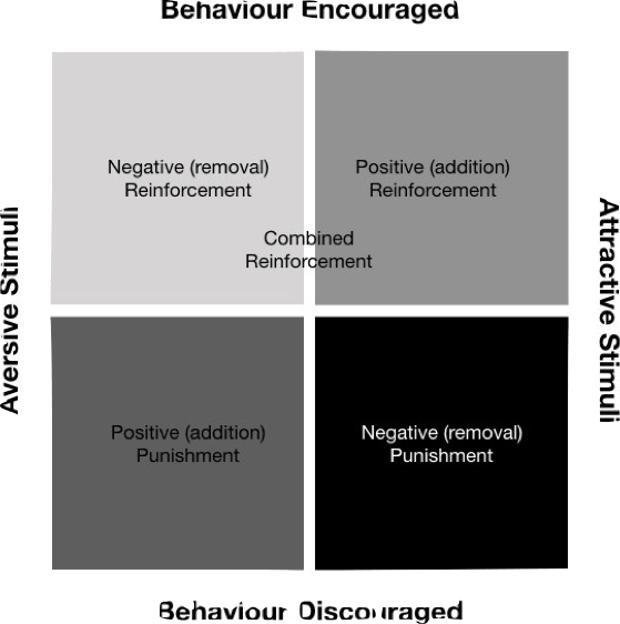 Operant conditioning is best explained with a picture. Things the horse doesn’t like are on the left, called Aversive Stimuli. Things the horse likes are on the right, called Attractive Stimuli. Both aversive and attractive stimuli can encourage behaviour (see the top quadrants) or discourage behaviour (in the bottom quadrants).